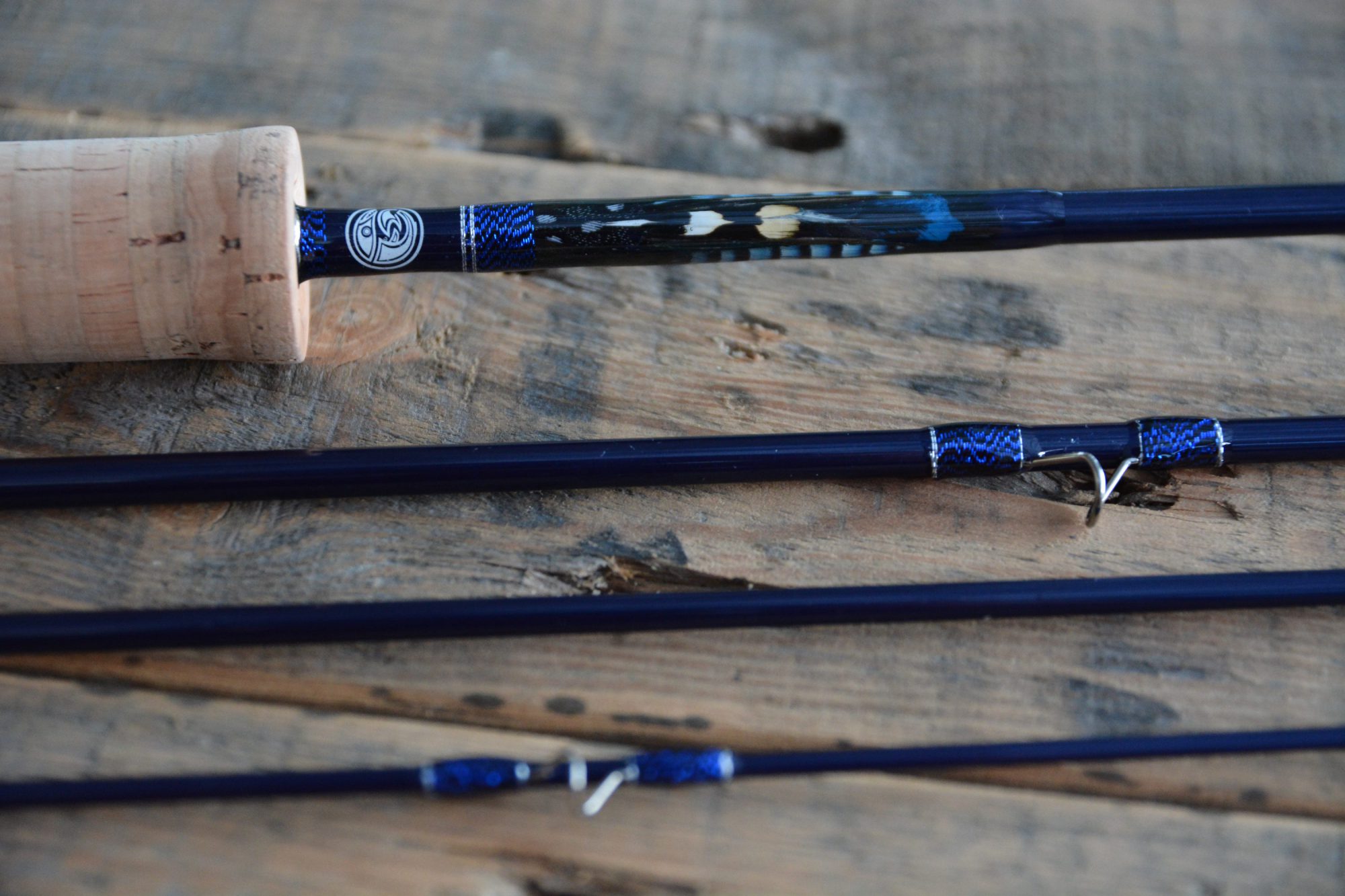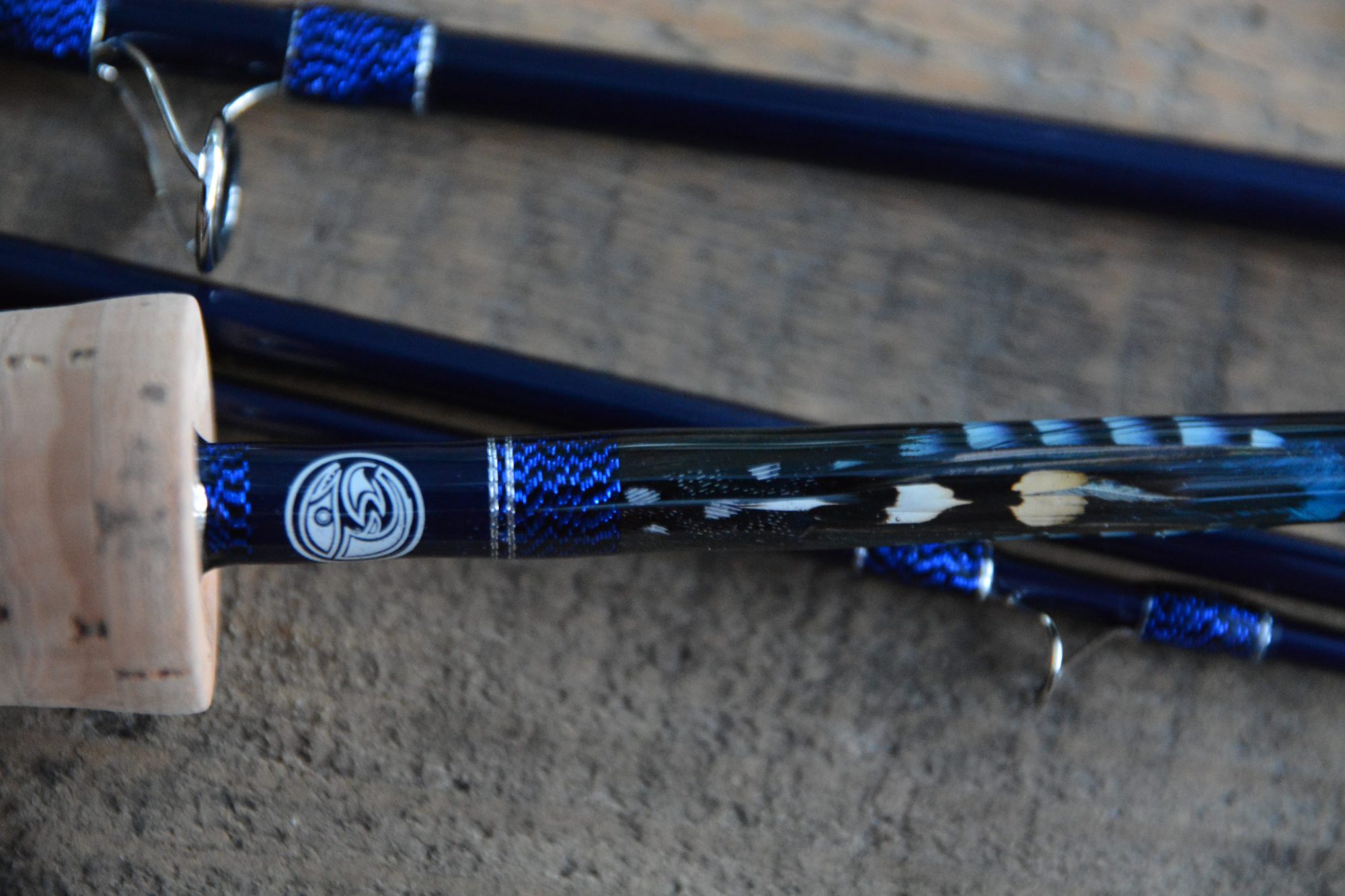 Der Griff besteht in Anteilen am Griff und Fighting Butt aus blaustabiliertem Holz. Dazu kommt wie immer der beste Kork, der sich finden ließ… Alps Hardware… und einem auf den Blank und die metallic blauen Ringwicklungen abgestimmten Inlay. Dieses wurde zusammengesetzt aus diversen Federteilen von Perlhuhn, Königsfasan, Eichelhäher, Jungle Cock, Pfau…