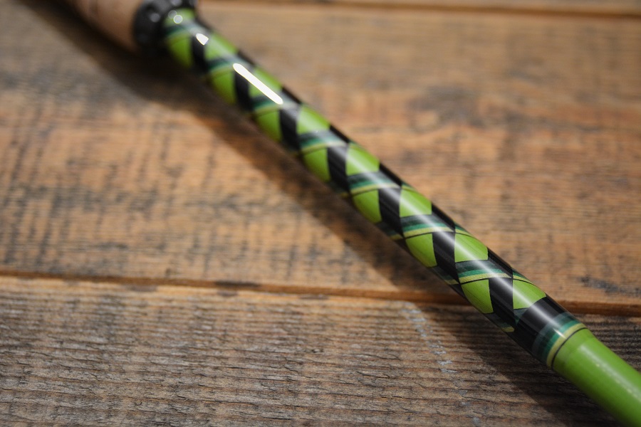 With this two glass-rods I wanted to try and show that there´s a lot possible with some ideas… You see here the same class 3 weighted blank, both had been green in the beginning. One stayed with that colour, the other got stripped and newly coloured and finished.